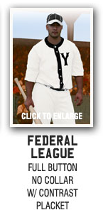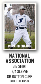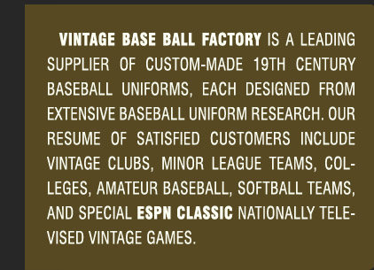 OUR MADE IN USA UNIFORMS ARE AVAILABLE IN MORE THAN A DOZEN HISTORIC 19TH CENTURY AND EARLY 20TH CENTURY STYLES. INCLUDE METAL BUTTONS, FELT LETTERING AND ASSORTED COLOR COMBINATIONS. BAGGY, LOOSE FITTING GENEROUS CUT TO ERA SPECS. EASY SIZE ORDERING – NO TEDIOUS MEASUREMENTS REQUIRED!